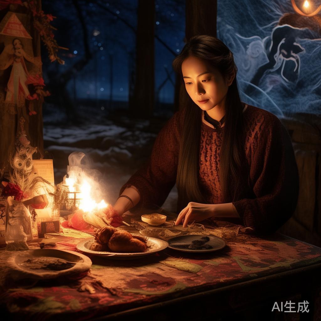 就在那夜的三更,香云准备了一桌法事,贴上星官马,点起香烛,把鸡肉和水摆上去,还剪下一缕寡妇的头发作符。之后,她念诵咒语,然后敲门,让寡妇高呼嗨运。在完成这一切后,她终于回家,留下寡妇在家静待结果。